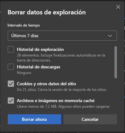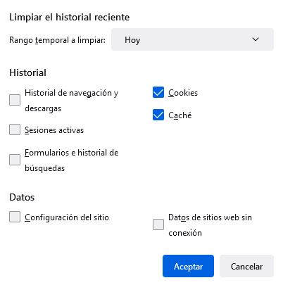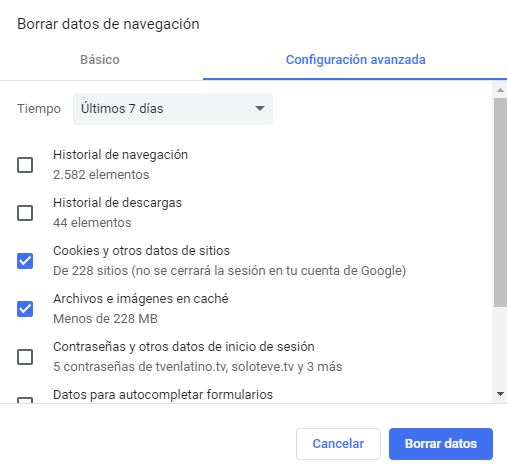 Desmarcamos Todos los campos dejando solo Cookies y otros datos del sitio y Archivos e imágenes en memoria caché